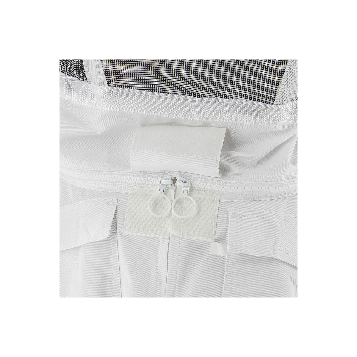 Elle possède une cagoule qui protège particulièrement bien le visage mais aussi des filets d'aération pour rafraîchir le corps de l'apiculteur lorsqu'il fait chaud. On apprécie les petits détails tels que les mitaines pour faire la jonction avec les gants et les élastiques à la taille et aux jambes.