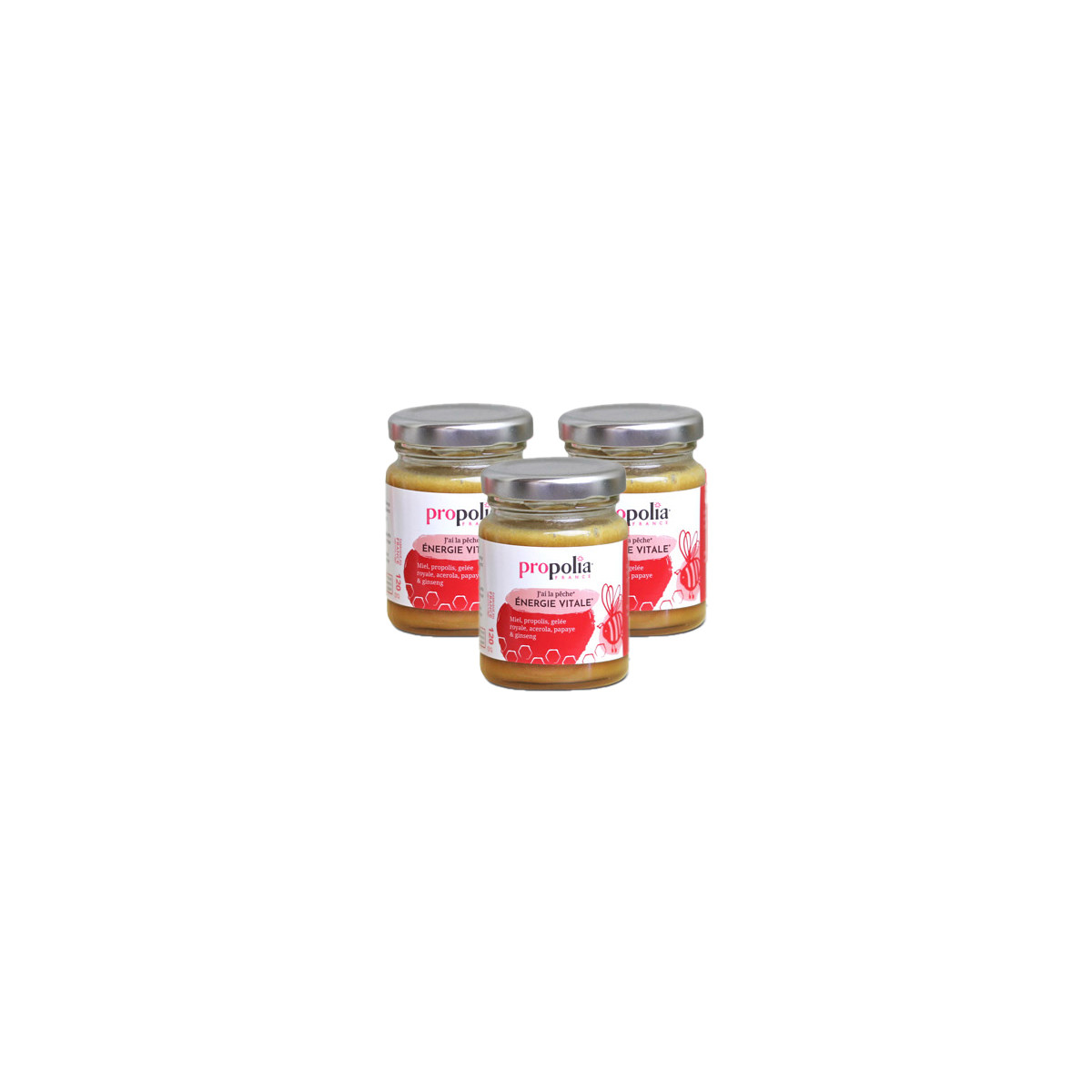 Ce concentré d'énergie associe les propriétés exceptionnelles de produits de la ruche, de fruits et de plantes : miel, propolis, acerola, papaye et ginseng pour un concentré aux agents actifs revitalisants.