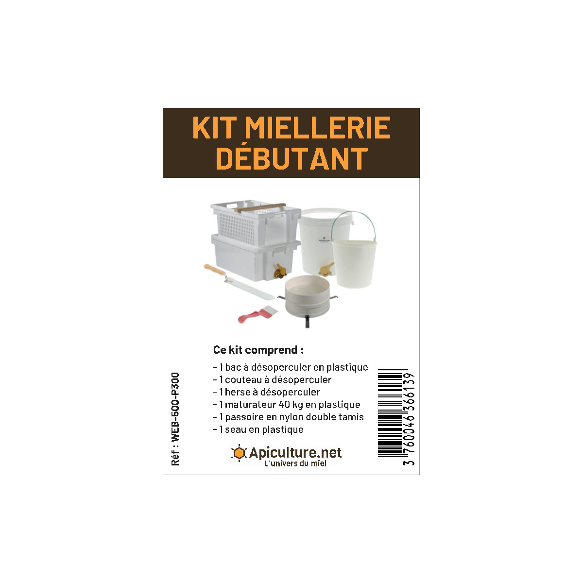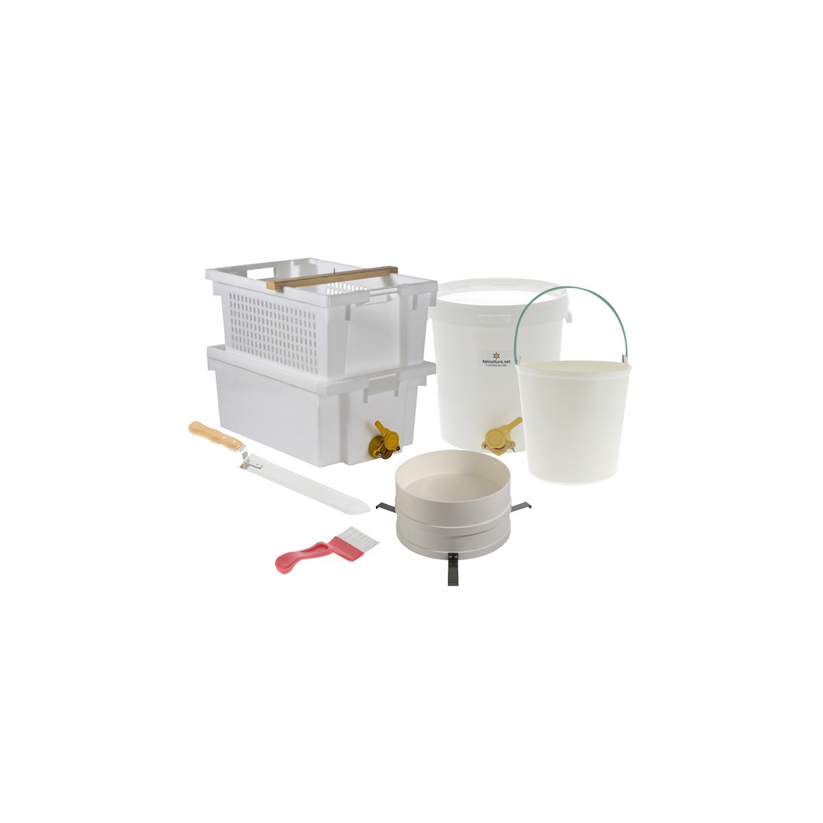 Le kit miellerie débutant s'adresse aux apiculteurs amateurs qui désirent produire une petite quantité de miel artisanal. Accessible à toutes les bourses, c'est un moyen bon marché pour fabriquer une petite miellerie à la maison capable de traiter le miel de quelques ruches.